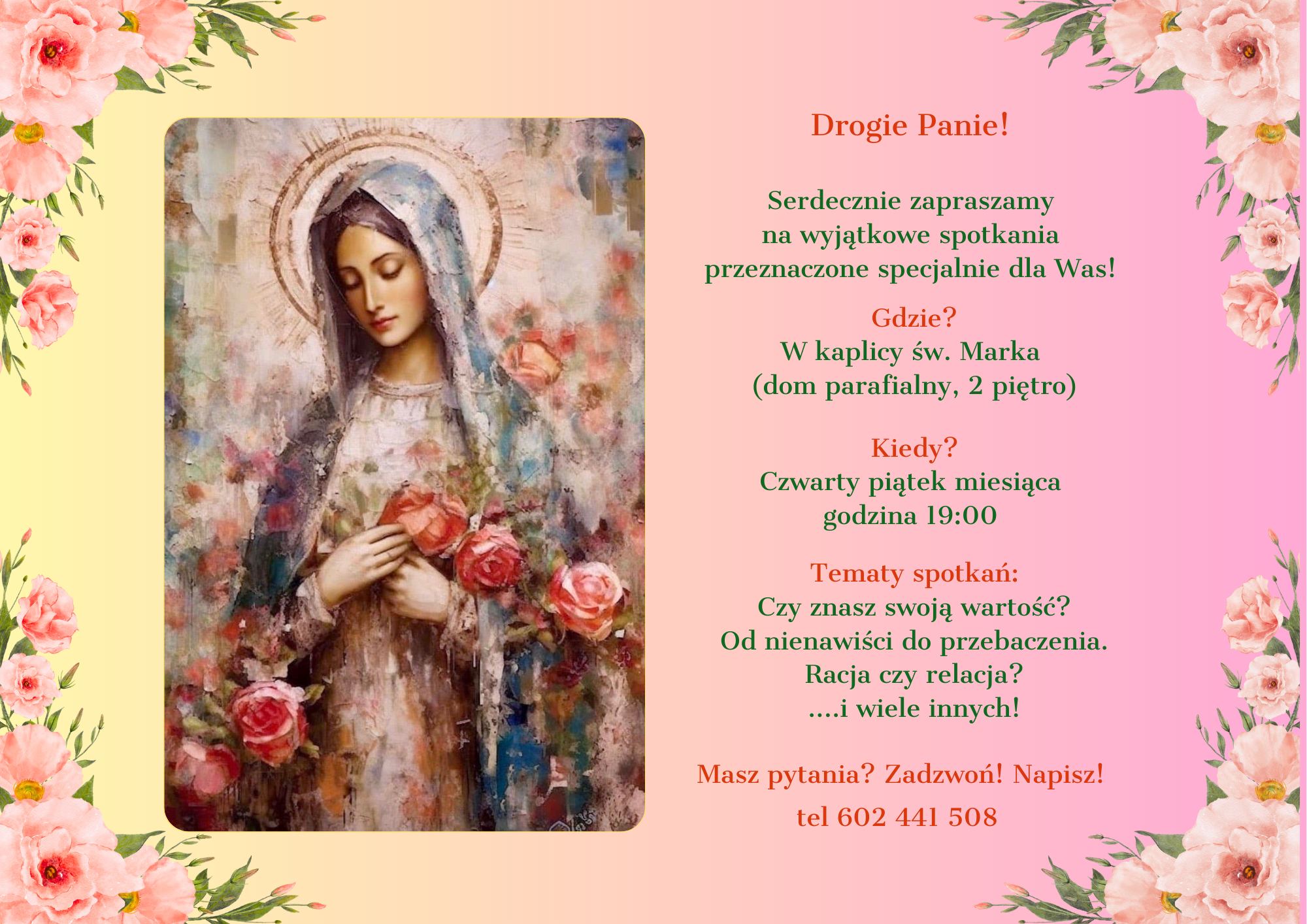 jeśli szukasz miejsca, gdzie będziesz mogła wzrastać duchowo i odkrywać dar kobiecości to dobrze trafiłaś! Zapraszamy Cię serdecznie na nasze spotkania prowadzone w formule otwartej dla wszystkich chętnych a nie tylko dla członkiń Wspólnoty Miriam.